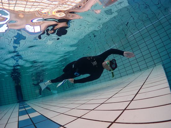浅い水中で潜れるようになったら足のつかない水深でも焦らず遊べるようになるために、深いプールで浮く練習を行います。大体目線が水面の高さで浮けるように最低限のウェイト(重り)を調整します。その他緊急時のベルトの捨て方や疲れたときの浮き方の練習なども行います。