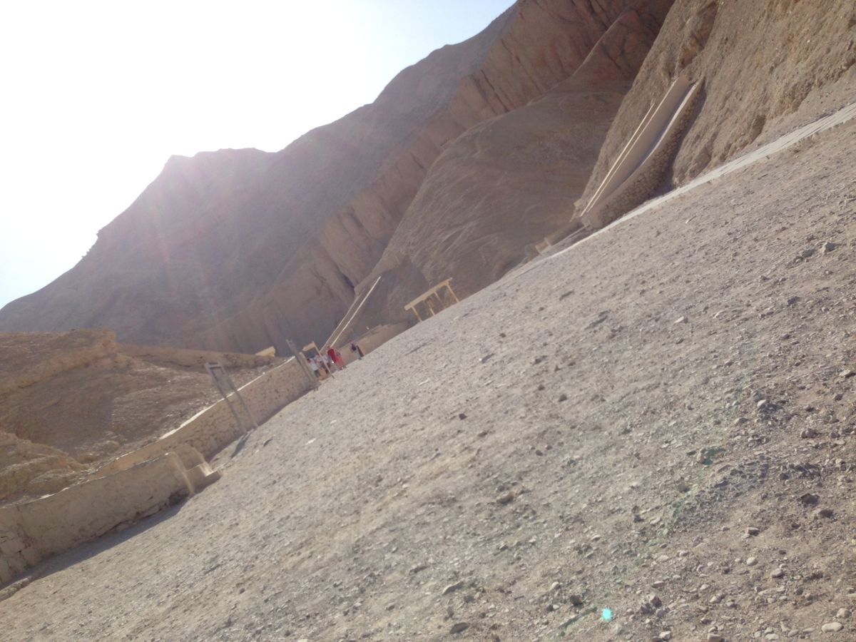 木も草もない荒涼とした岩山に、60以上の王家の岩窟墓が造られたという、歴史ロマンに溢れた場所です。ツタンカーメンの墓に入るには別途100L.E(1500円くらい)が必要ですが、ここに2日前にカイロのエジプト考古学博物館で見た黄金のマスクやコンドームがあったと思うと、興奮です!この唯一盗掘されなかったツタンカーメンの墓が王家の谷にある60以上の墓で最も小さく、それにも関わらずあれ程の財宝があったということで、他の墓にはどれ程の財宝があったのかと思うと、ますます歴史ロマンを感じます。他に壁画が美しいラムセス6世の墓と最大規模のセティ1世の墓に入りました。