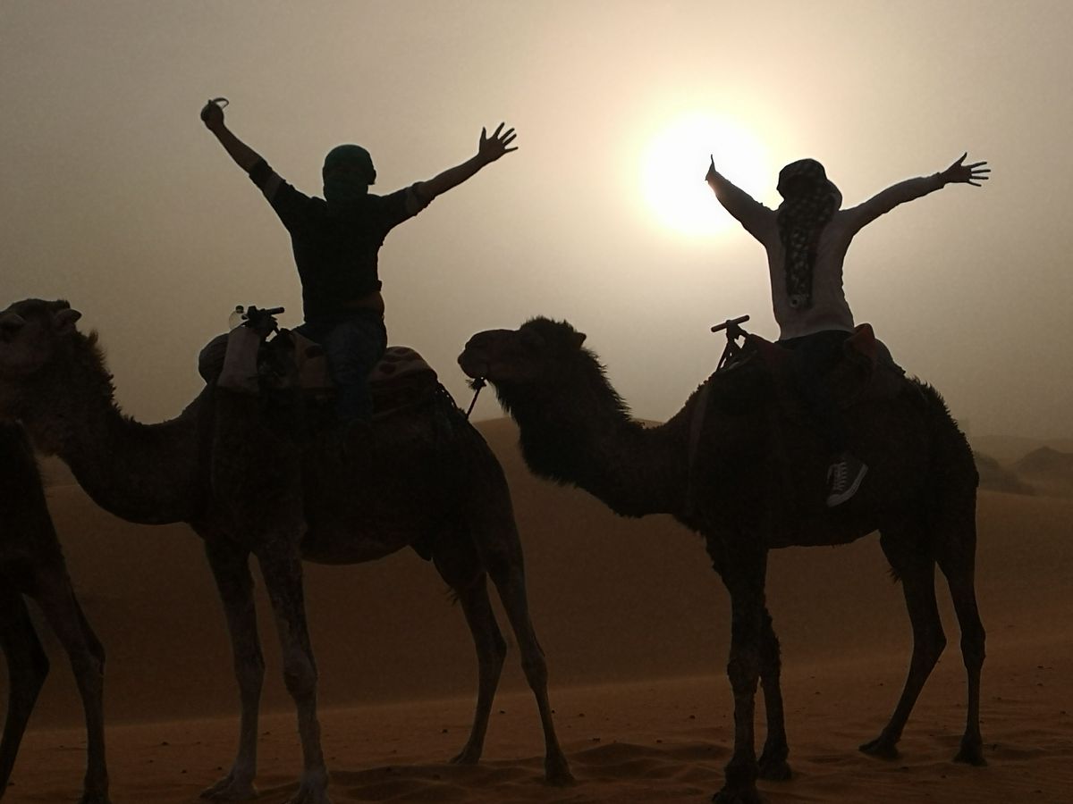 最大の見所であるサハラ砂漠ですが、運悪く、着いたときに砂嵐でした。ラクダツアーも出発を遅らせてくれましたが風は止まず、強風の中の強行軍となりました。砂が眼球を叩きつけ、耳の奥まで入ってきます。視界も悪かったですが、これはこれで良い体験をさせてもらいました。翌日朝はすっきり晴れたのでちゃんと砂漠を堪能できました。