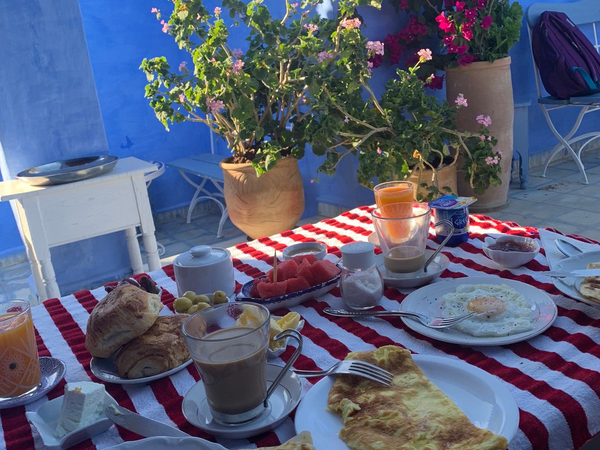 初日のシャウエンのリヤドは、今までに味わったことのない佇まいの宿泊施設でしたし、翌朝の朝食はテラスで頂き、また格別でした。街のブルーの世界も一見の価値有りです。