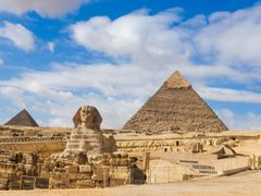 世界七不思議の1つに数えられるギザの三大ピラミッドへ。クフ王、カフラー王、メンカウラー王の巨大なピラミッドが並ぶ壮大な景観は圧倒的な存在感を放ちます。