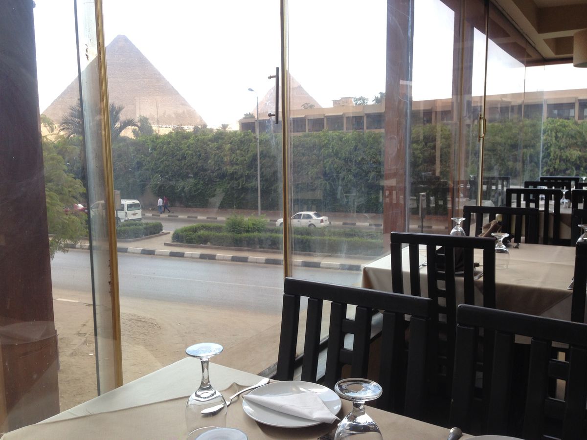 ピラミッドが見えるレストランで、軽めの昼食。前菜からガイドさんが日本語で説明をしてくれます。ホテルの朝食にもあったペーストがゴマペーストであることが判明。焼きたてのパンに付けると美味でした。メインの味付けも日本人好みのあっさりめで、ライスがあるものも助かりました(エジプト人はパンとライスを7:3程度で食べるそうです)。