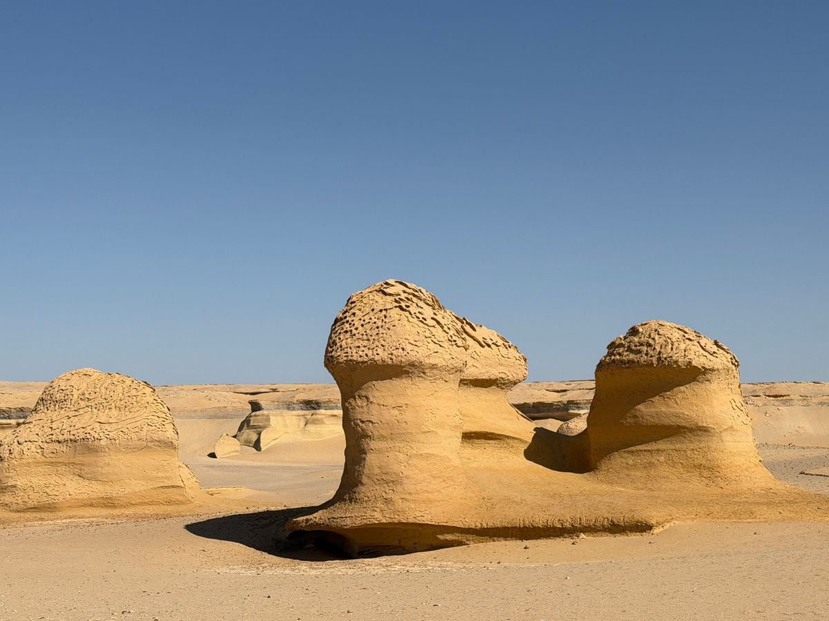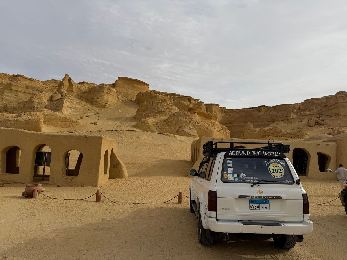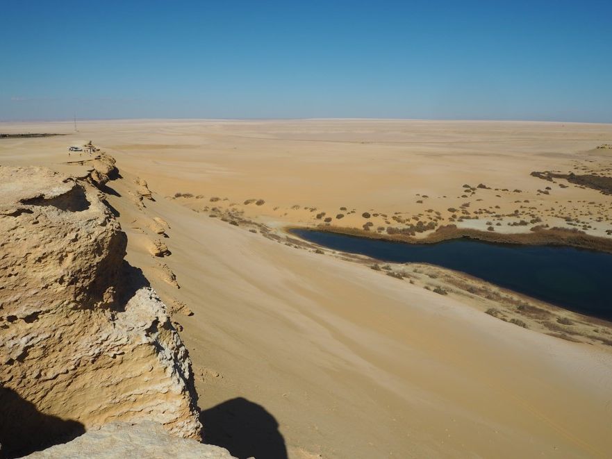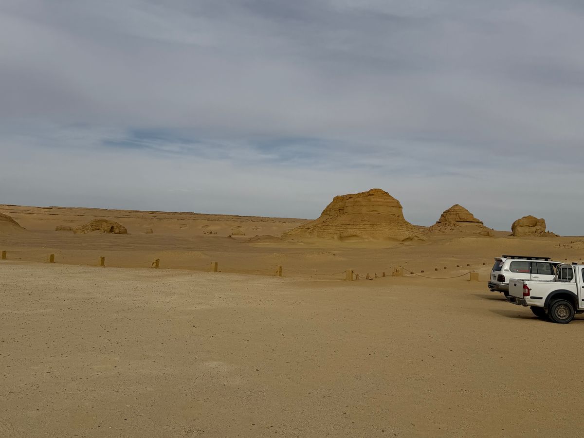 カイロから片道2時間+砂漠内ツアー4時間+食事1時間な感じでした。私と妻と日本語ガイドさんとドライバーさんの4人でランドクルーザーに乗っての日帰りツアーでした。前日にツアーでピラミッドや博物館等の観光をしていたので、この志向の違ったアドベンチャーツアーも大変楽しい時間を過ごすことが出来ました。360度グルリと砂漠の絶景や車で砂漠内を爆走(安全運転ですよ)等の日常生活に無い経験が出来た事、親切で詳しく説明してくれたガイドさんとドライバーさんに感謝、大満足のツアーでした。写真のように砂漠の岩山にガンガン車で登り、崖っぷちからオアシス(湖)を覗き込む体験はなかなか出来ないと思いますよ。