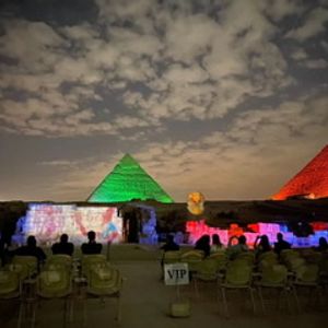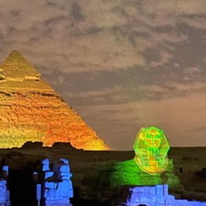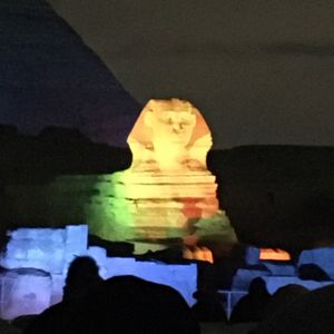 ショーはエジプトの歴史のナレーションとともに、スフィンクスとピラミッドを様々な色の光で照らしながら進みました。壁にプロジェクションマップのように歴史を表す絵柄も現れます。昼とは違う色のピラミッドが見れてよかったと思います。