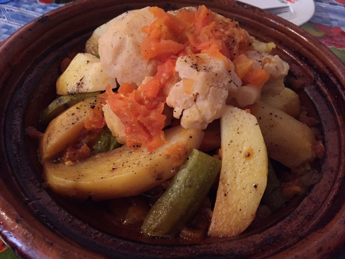 ラクダを降りたら、地元の小さな市を見物(これは土曜日にだけ開かれる市だそうです)、それからガイドさんの自宅にお邪魔して、サラダや自家製パン、そしてタジン料理の昼食を御馳走になります。この手料理が本当に美味しい。