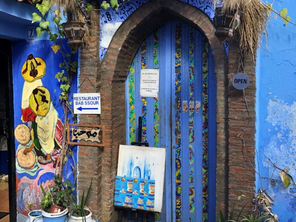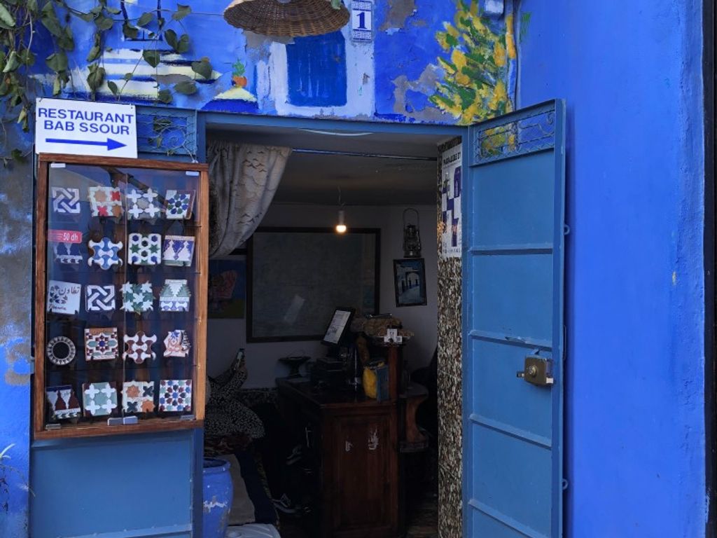 シャウエンの手前の写真ポイントでいったん車を止め シャウエン全景の写真をとり、シャウエンには、12時ごろ到着しました。ドライバーさんが昼食レストランの場所がわかっていず、電話で確認していたが、今度は、車を駐車できるスペースがなかなか探せず、時間がかかってしいました。 駐車場へ入れた後、ドライバーさんが、昼食レストランへ案内してくれるが、初めてのためか何度か聞いて、レストランへ到着しました。 そこで、帰りの為の待ち合わせ時間と場所を決め、ドライバーさんとは一旦わかれます。レストランは、BOB SSOURで 斎藤さんがオーナーです。 斎藤さんは、アラブ人ですが、顔立ちが日本人のようで 日本語も完璧です。 シャウエンやモロッコの話をいろいろと聞けてよかったです。 昼食込みのツアーで、メインはタジン料理から選び 飲み物は、別料金とのことでした。 タジンの種類は多く 肉料理のほか シーフード イワシ カジキ イカ などがあり、 イワシ と カジキをオーダーしました。 飲み物は、オレンジジュースとアボカドミルクを頼みました。 それぞれ 30DHで観光客料金ですが、前菜 タジン デザート ドリンクとも 美味しかったです。 タジンというとチキンとかビーフ 羊など肉料理か野菜料理と思っていたので、魚 イワシ カジキも新鮮でおいしく食べました。昼食なしのツアーでは、斎藤さんに会えなかったので昼食付でよかったと思いました。