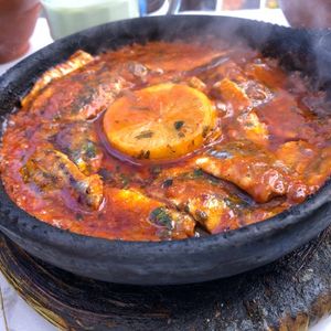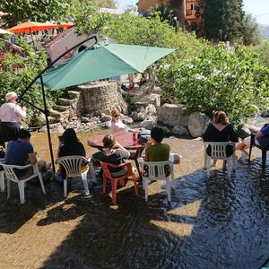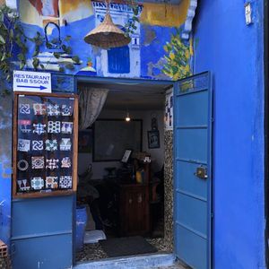 シャウエンの手前の写真ポイントでいったん車を止め シャウエン全景の写真をとり、シャウエンには、12時ごろ到着しました。ドライバーさんが昼食レストランの場所がわかっていず、電話で確認していたが、今度は、車を駐車できるスペースがなかなか探せず、時間がかかってしいました。 駐車場へ入れた後、ドライバーさんが、昼食レストランへ案内してくれるが、初めてのためか何度か聞いて、レストランへ到着しました。 そこで、帰りの為の待ち合わせ時間と場所を決め、ドライバーさんとは一旦わかれます。レストランは、BOB SSOURで 斎藤さんがオーナーです。 斎藤さんは、アラブ人ですが、顔立ちが日本人のようで 日本語も完璧です。 シャウエンやモロッコの話をいろいろと聞けてよかったです。 昼食込みのツアーで、メインはタジン料理から選び 飲み物は、別料金とのことでした。 タジンの種類は多く 肉料理のほか シーフード イワシ カジキ イカ などがあり、 イワシ と カジキをオーダーしました。 飲み物は、オレンジジュースとアボカドミルクを頼みました。 それぞれ 30DHで観光客料金ですが、前菜 タジン デザート ドリンクとも 美味しかったです。 タジンというとチキンとかビーフ 羊など肉料理か野菜料理と思っていたので、魚 イワシ カジキも新鮮でおいしく食べました。昼食なしのツアーでは、斎藤さんに会えなかったので昼食付でよかったと思いました。
