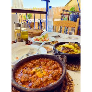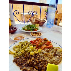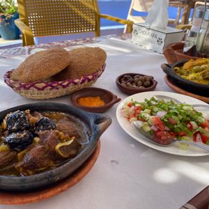 食事時間はついてすぐにするか後にするか決められたので、散策後に。ランチ内容は2種類のモロッカンサラダにパン、オリーブ、タジン鍋(牛肉、チキン、野菜から選べる)でした。量も多いし美味しくて大満足!屋上の屋根付きテラス席を選んだので、そこからの景色も最高でした!
