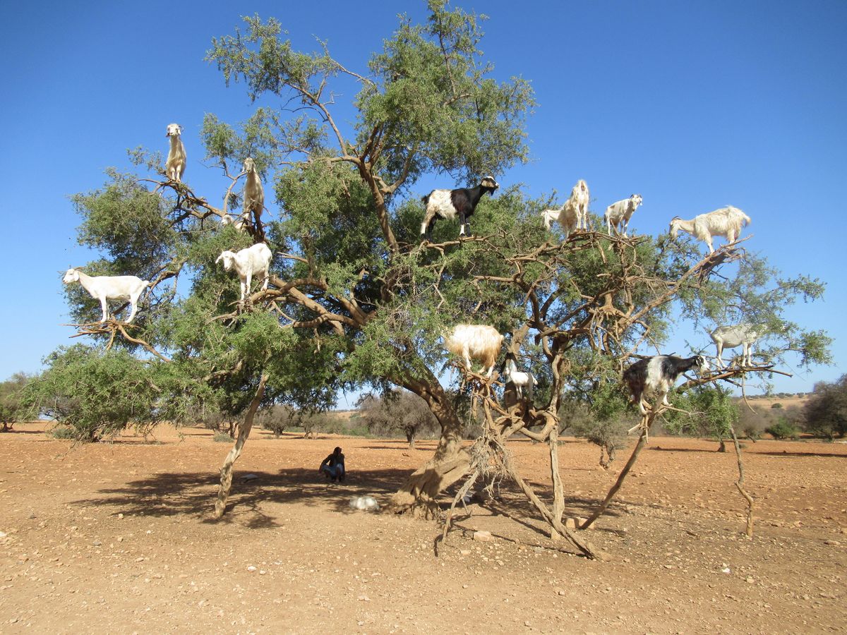 参加者は我々2名だけ、ドライバーのムスタファさんは安全運転でした。途中でカフェでのトイレ休憩、アルガンの木に登っている(登らされている)ヤギの見学(チップを払って写真撮影)、アルガンオイルの工場見学をしてエッセウィラにはお昼前に到着しました。