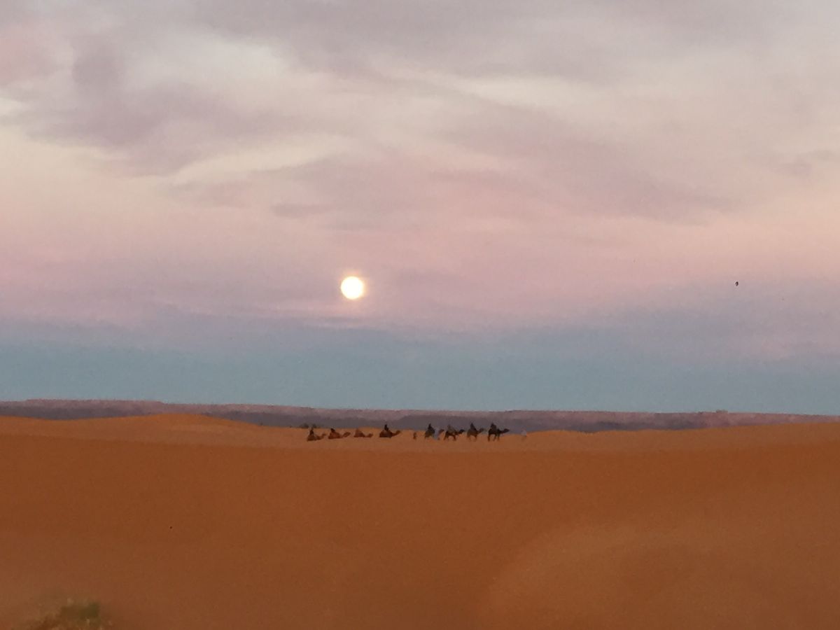 砂漠で満月だったのですね。満点の星空とはいかなかったかもしれませんが、月明かりに浮かぶ砂丘を眺めることができたのも貴重な体験だったと思います。