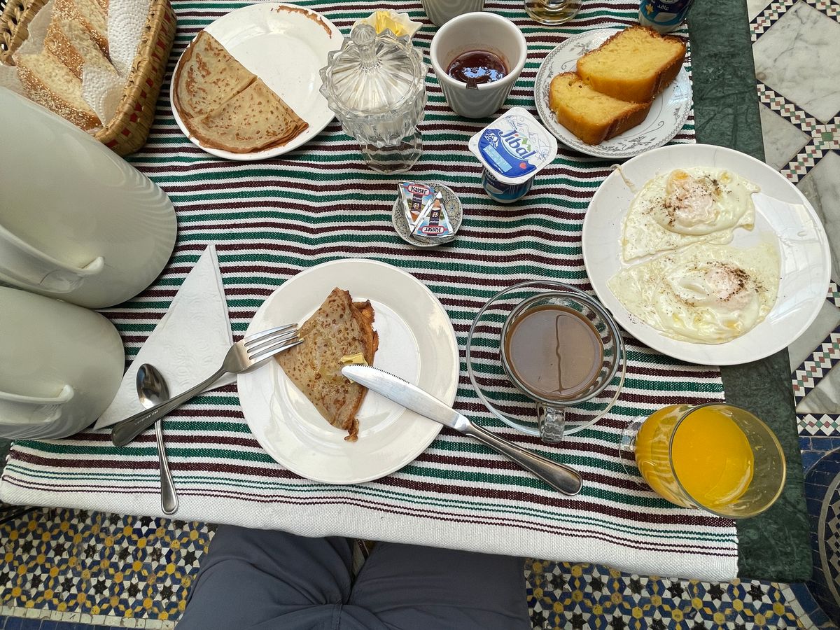 ティーは砂糖が無くても美味しかったです。モロッコの朝食はパンが主食でどのホテルもリアドも同じ様なメニューでした。