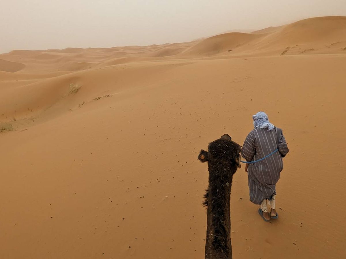サハラ砂漠は運悪く砂嵐、到着日予定のラクダ乗りも断念。