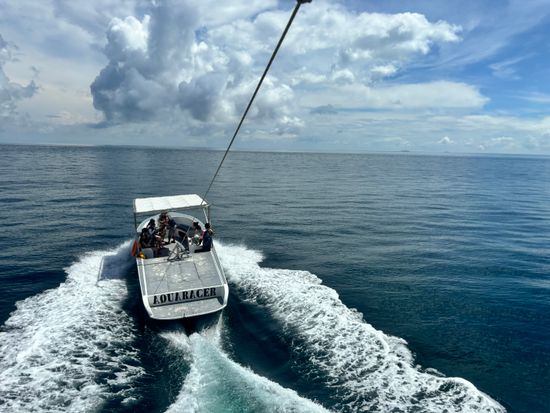 中々日本では体験出来ない 良い体験を手軽に出来ます ホテルへの迎えはジプニー で来てくれて、これもフィ リピンを味わえる楽しい思 い出になります。簡単な説 明を受けて、ボートを乗り 継いで沖合に出たら順番に 飛んでいきます。私の参加 した回は4組で、1組10分ほ ど青空散歩できます。体感 的にはすごく長く感じスリ リングもあり満足度の高い オプショナルツアーでした。 その後すぐ近くのスパにいき シ