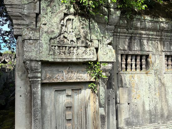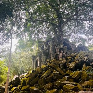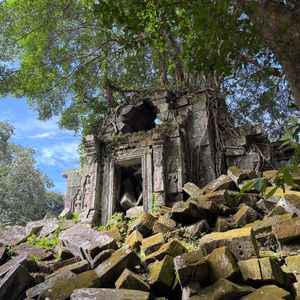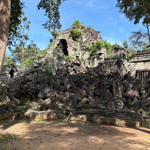 ベンメリアは密林の遺跡というだけあり、遺跡が木の根に飲み込まれた様子がとても印象的でした。雨季が終わる頃に訪れましたが、崩れた石材を一面の苔が覆う幻想的な緑の景色に感動しました。宮崎駿の世界と聞いていましたがまさにその通りでした。乾季には苔が茶色に変色するためこの時期が一番綺麗でお勧めだそうです。いずれはアンコールワット同様に崩れた遺跡を修復して公開する計画があるとのことですが、発見されたままの姿も感慨深いです。ガイドさん曰く、以前は見学もアスレチックのような険しいルートだったそうですが現在は遊歩道が完備され軽装で大丈夫でした。
