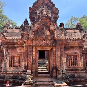 ガイドのクンさんは女性でとても丁寧な案内でした。写真もいっぱい撮ってもらいました。お寺は赤色の砂岩でできていて、アンコールワットなどの主要なお寺とは雰囲気が違います。ここは東洋のモナ・リザで有名でとても美しいですが、門などに刻まれた彫刻がとても素晴らしいです。シェムリアップの彫刻では一番だと思います。後に行ったアンコール国立博物館に展示してあるたくさんの彫刻(レプリカ?)も素晴らしかったですが、ここの彫刻は最高峰だと感じました。1000年以上の時を経て現存している寺院と彫刻に感動しました。