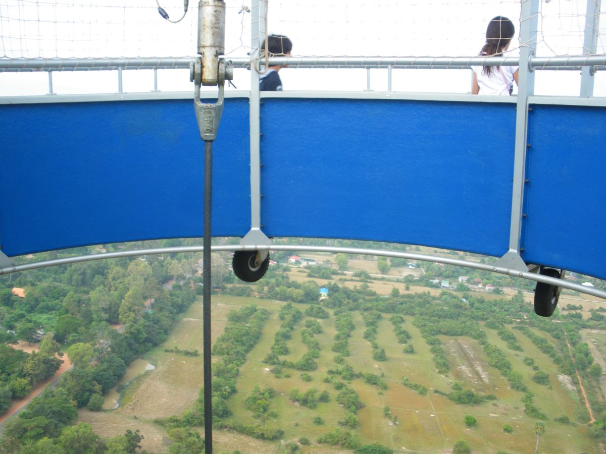 日の出・日の入りの時間帯はとても混雑しているようですが、日中だったので8人のみで乗車しました。乗車する所はドーナツ型で中心部は空いていますが、しっかりとワイヤーで引っ張られている為揺れず、ゆっくりと上昇していくので怖さはありません。上昇すると15分位止まっており360度の展望が出来ます。あいにくアンコールワットはモヤがかかっていたので少しかすんでいましたが、反対側にはトンレサップ湖も見え、ジャングルと畑のコントラストがとても美しかったです。
