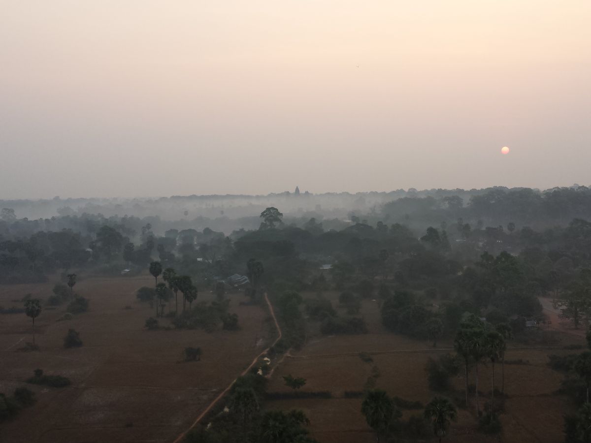 気球には一度テスト飛行後に乗り込みました。気球に乗る前は曇っていて、朝日は見れないかもしれないと言われましたが、綺麗な朝日を見ることができました。気球は鉄製で大きいものでしたので、怖さはありませんでした。アンコールワットは見えましたが、少しもやがかかっており、距離もあったちめ、はっきりとは見えませんでした。