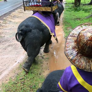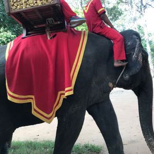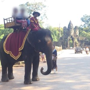 20分くらい象に乗って遺跡に向かいます。ガイドさんが象に乗っている時に写真を撮ってくれます。象使いの方は、日本語は話せませんが、とても気遣いを感じました。象も大人しく、ゆっくり歩いてくれます。1ドルチップを渡すといいです。良い体験でした!