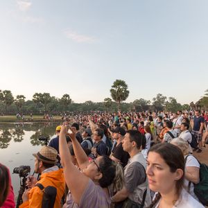 早朝ですが、ツアーで参加した時点で既に現地には大量の観光客が待機しています(彼らは個人でトゥクトゥクなどを手配した欧米人が大半です)。そのため、三脚を持ってしっかりとした写真を撮るのは非常に困難です。自分の場合は、一眼レフに1脚をつけて、人の頭の上から持ち上げる形での撮影です。ISOに妥協すればぶれない写真を撮ることは可能です。