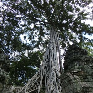 まず南大門から入り、説明を受けながら進んでいきます。バイヨン寺院、パプーオン、象のテラス、ライ王のテラスと歩いていきました。パプーオンは急な階段を登るため、登るか登らないか尋ねられました。登ると答えると、40分間ほどを目安に登ってきてと言われました。手すりはさびているので軍手をはめ登ります。とても急で手すりを触らずに登るのは困難なので忘れずに。遺跡まわりでとても重宝しました。本当に本当に日差しも強いので、ふちの広い帽子も必須です。ライ王のテラスまで行くと、車に乗り、お昼前最後の遺跡タ・プロムへ。写真スポットにはたくさんの人がいますが、たくさんガイドさんに写真を撮ってもらいました。