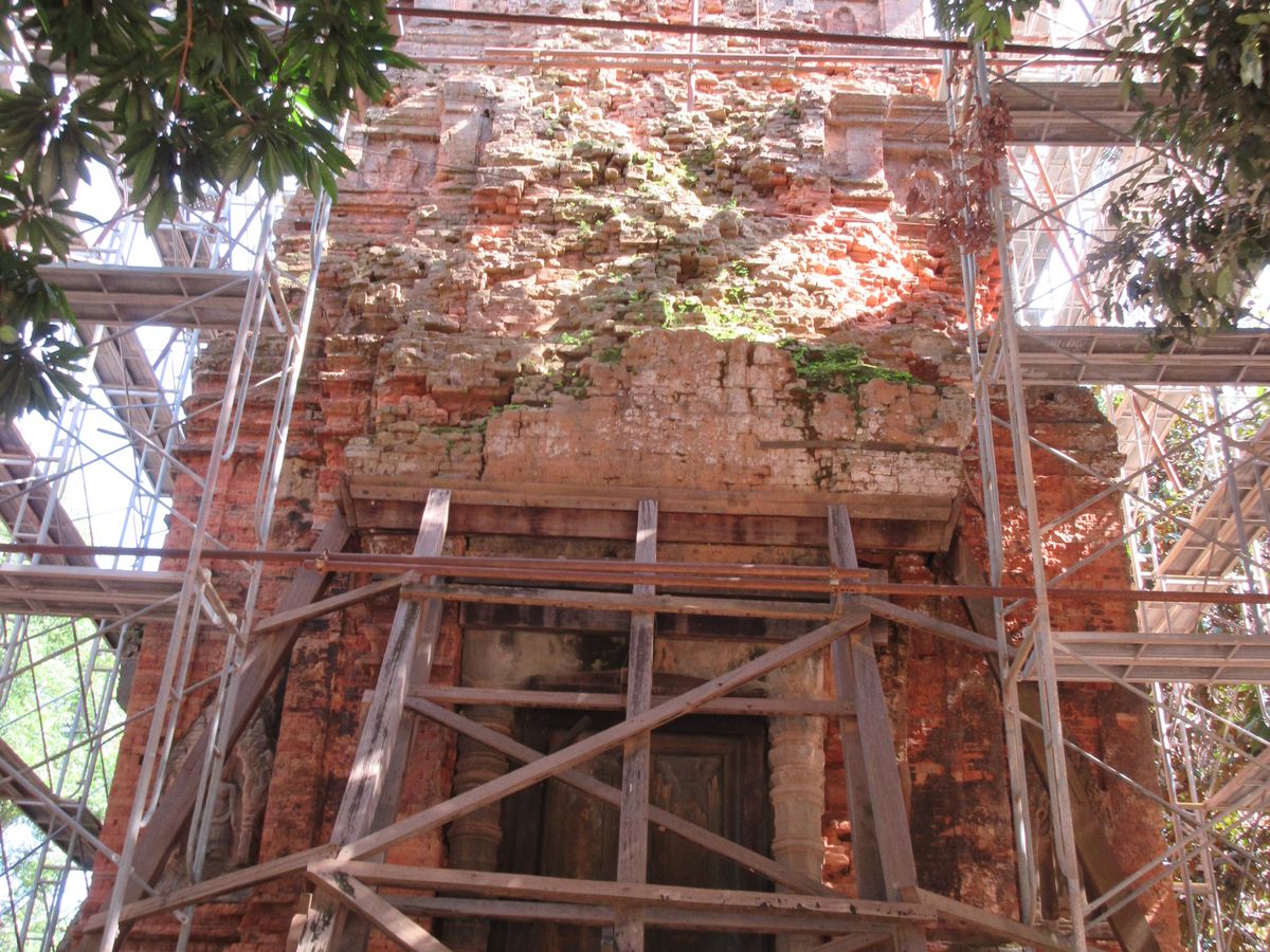 ロリュオス遺跡はアンコール遺跡群よりも古い時代のレンガ作りの遺跡です。レンガの上にかぶせた漆喰の跡なども残っており、すごく面白い遺跡です。