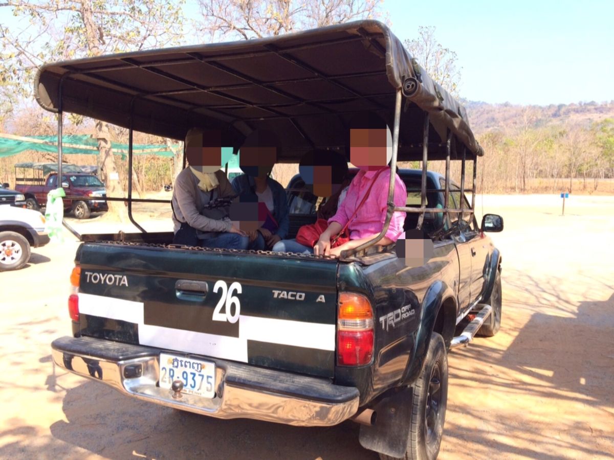 シェムリアップの中心街から、ガタガタの道を揺られて3時間。そこから4WDに乗り換え急斜面を登って行ってやっと到着です。バスの中で寝ようと思ってもあまりに揺れが凄くてマトモに寝られなかったので、ネックピローを持ってる方はぜひ持って行ったほうがいいと思います。歩く時は車内に置いていけば良いですし。私はバスの揺れで首が物凄く痛くなってしまい、持って行かなかった事を後悔しました。