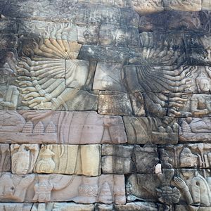 アンコールワットの石壁に刻まれた、美しいデバダー(天女)の彫刻。細やかな装飾や表情の繊細さが、クメール王朝の芸術の高さを物語っています。長い年月を経ても、その優雅さは色褪せることなく、訪れる人々を魅了します。