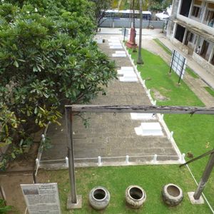 「笑い禁止」の看板がたてられています。生々しく痛々しい場所です。約1畳くらいの広さ の独房、外壁に小さな穴が1つずつ設けられています。この穴は何・・・!?また天井を見てみてください。ガイドさんから詳しくお話が聞けることでしょう。
