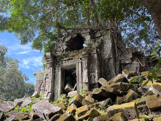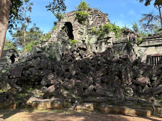 ベンメリアは密林の遺跡というだけあり、遺跡が木の根に飲み込まれた様子がとても印象的でした。雨季が終わる頃に訪れましたが、崩れた石材を一面の苔が覆う幻想的な緑の景色に感動しました。宮崎駿の世界と聞いていましたがまさにその通りでした。乾季には苔が茶色に変色するためこの時期が一番綺麗でお勧めだそうです。いずれはアンコールワット同様に崩れた遺跡を修復して公開する計画があるとのことですが、発見されたままの姿も感慨深いです。ガイドさん曰く、以前は見学もアスレチックのような険しいルートだったそうですが現在は遊歩道が完備され軽装で大丈夫でした。
