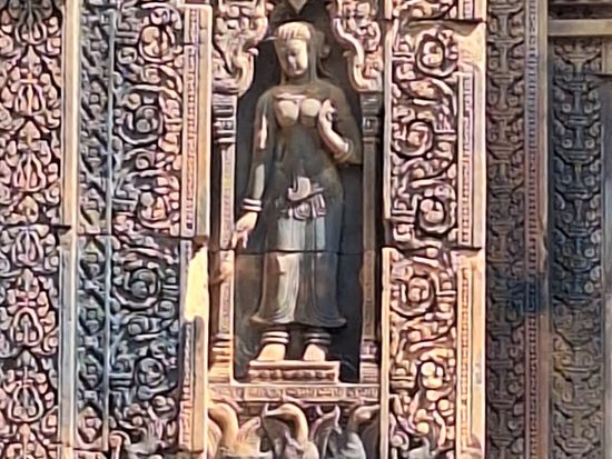 「女の砦」の意味を持つこの遺跡は、紅色砂岩を用いた珍しい寺院でその名の通り優美な造形はアンコール遺跡の中でも群を抜いて美しいと称される。第二回廊に精巧に彫られたレリーフや祠堂の壁面に施された「東洋のモナリザ」デヴァダー像は特に有名!驚くべきレリーフ美の数々を堪能して。