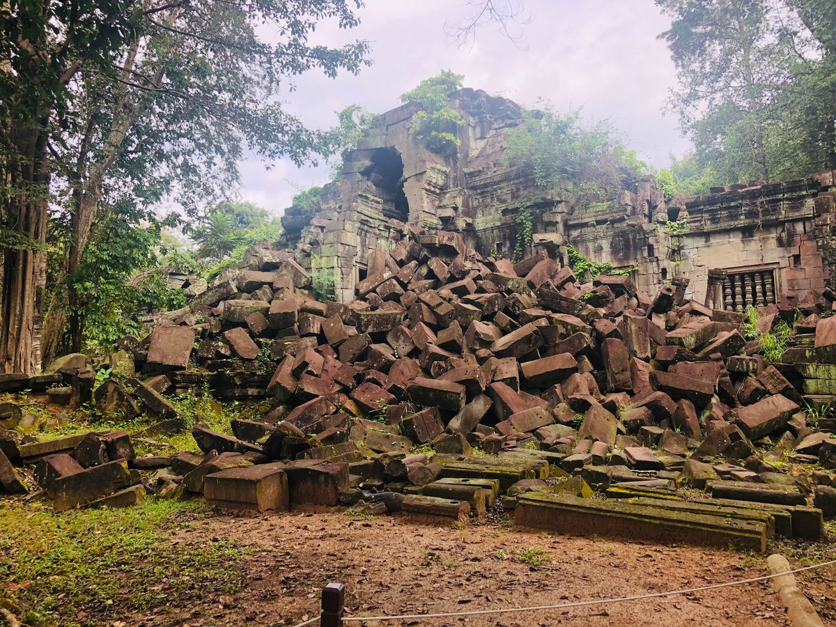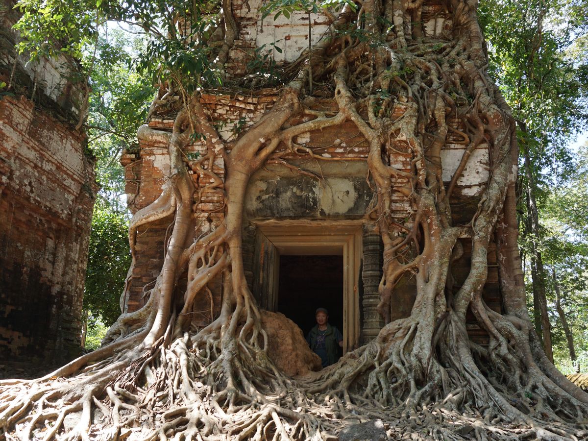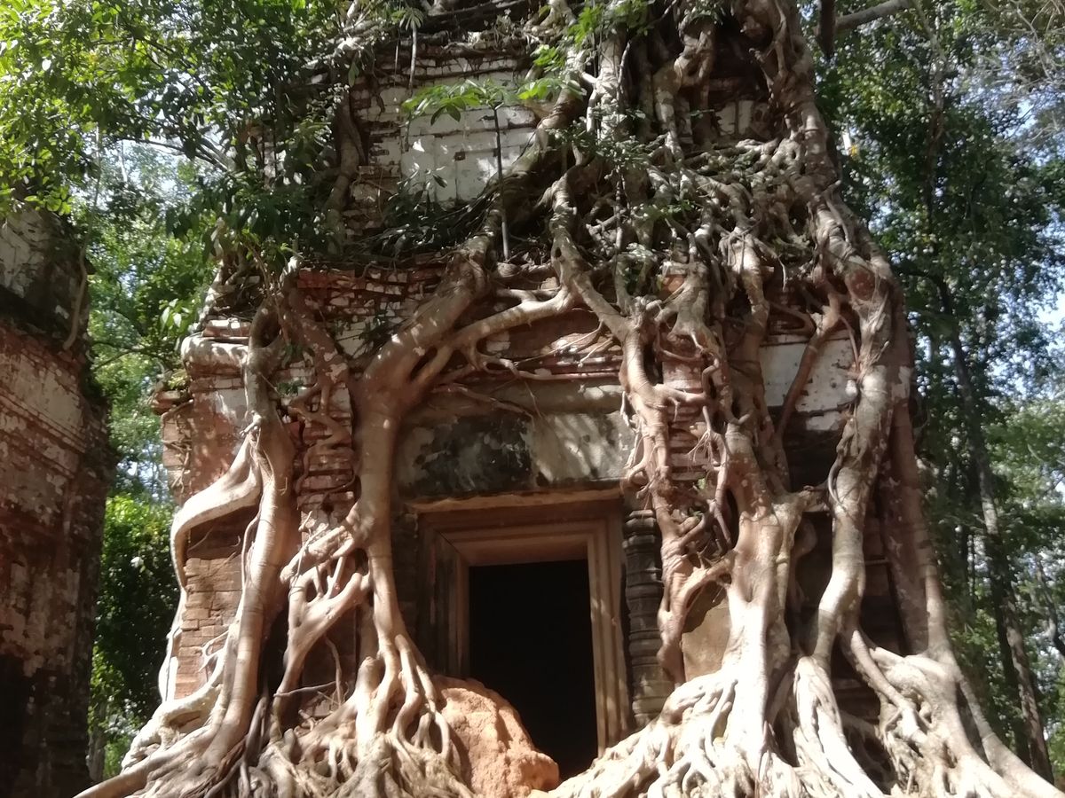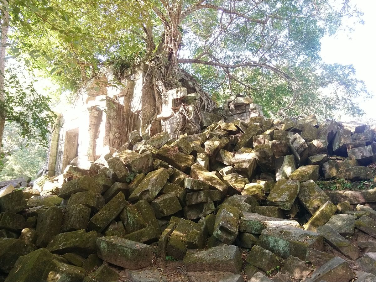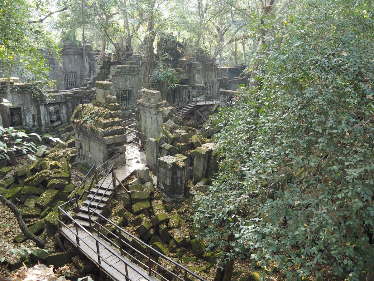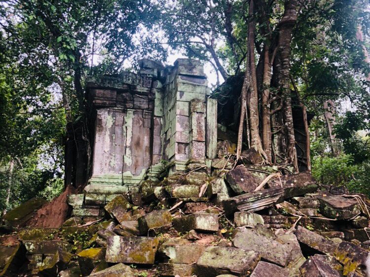 アンコール・ワットのように整備された遺跡というよりは自然に近い遺跡が見られて、そのようすがジブリの「ラピュタ」のような景色でした。雨季のほうが苔が青々としてよりラピュタ感があるそうです。