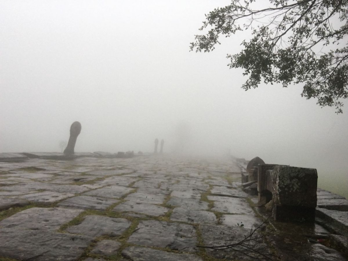 当日は朝から天気が良くなく、プレアヴィヒアに登ると濃霧と暴風に襲われました。ガイドのケローさんもこんなに風が強いのは初めてとのこと。傘をさしてる方もいましたが殆ど役に立たず、カッパと着替えは携帯すべきと痛感しました。運良く風邪は引きませんでしたが、中々の寒さでした。