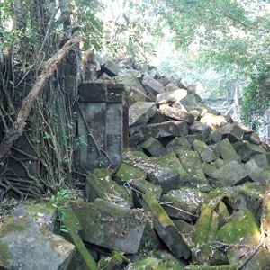 まだ朝の早いベンメリア。静けさの中、鳥のさえずりに耳を澄ませながら歩んで行くと目の前に実に不思議な光景が。森の中にひっそりとたたずむ建物は、木々が絡み合い自然と一体となってまるで物語の世界に迷いこんだかのようです。コーケーの美しい彫刻の門から入り口を進んで行くと、それまで見えなかった巨大な建造物が突如として現れます。それはアンコールの遺跡群では見られなかったピラミッド型をしたものであり、その高さと大きさに圧倒されます。少しでも天に近づくためにとの王の願いを叶えた民衆の苦労がうかがえると共に王の偉大な存在に気付かされます。プレアヴィフィアは長い道のりでしたが、行ったかいがありました。この絶景。この山頂にこのような偉大な建築物を築いた王様の権力がうかがえます。眼下に広がるこの世界が自分の治める天下だと思うとその喜びはひとしおだったことでしょう。男のロマンですよね。