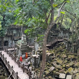 ベンメリアは、行く前は瓦礫の山のように想像していましたが、全然違いました。ジャングルと遺跡のコントラストが素晴らしいです。午前中は観光客もそれほど多くなく、タ・プロームのように混雑して身動きが取れないようなことはありません。鳥のさえずりを聞きながら木漏れ日の中をゆっくり散策できます。観光ルートは木道で舗装されており、基本的に歩きやすいですが、一部ほぼ光のささない隧道を抜けたり、瓦礫伝いに歩く場所もあるので、注意は必要です。