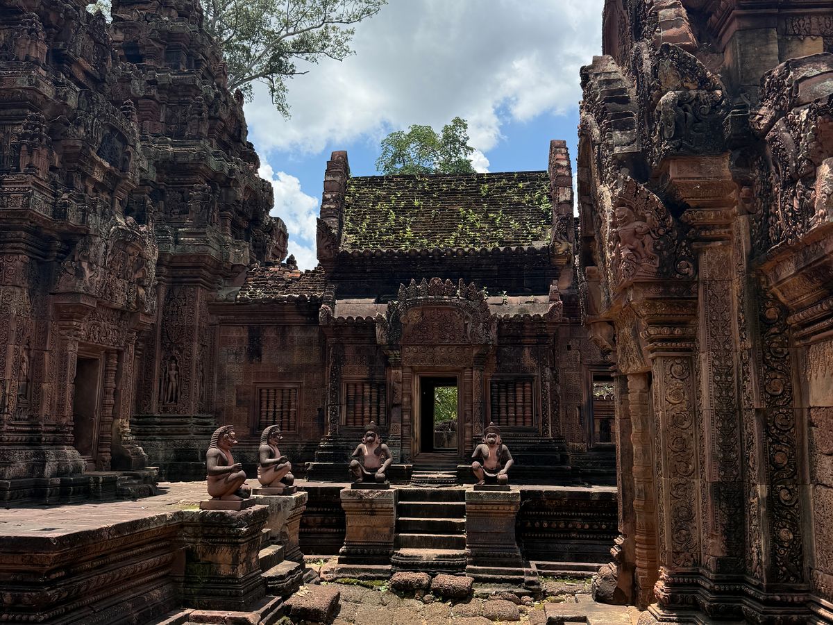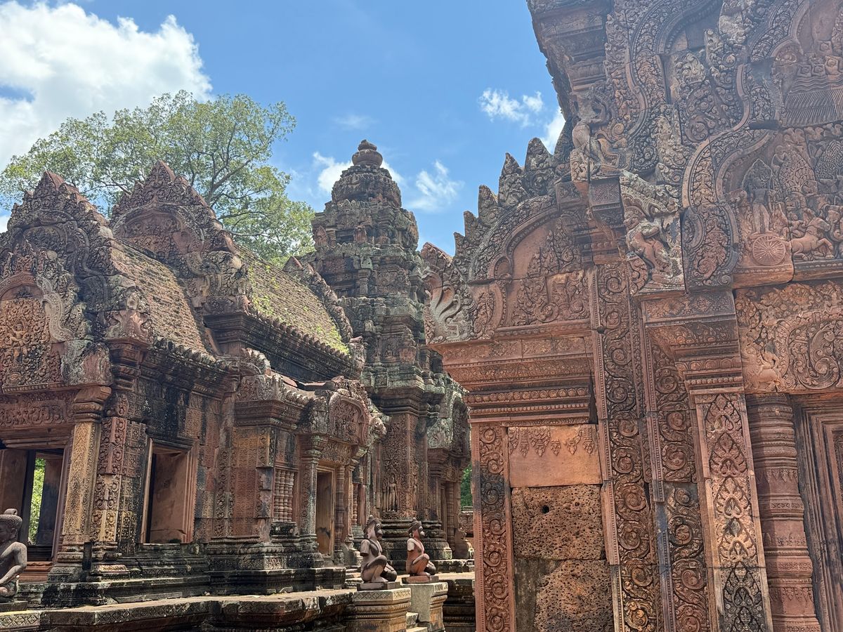 ガイドのクンさんは女性でとても丁寧な案内でした。写真もいっぱい撮ってもらいました。お寺は赤色の砂岩でできていて、アンコールワットなどの主要なお寺とは雰囲気が違います。ここは東洋のモナ・リザで有名でとても美しいですが、門などに刻まれた彫刻がとても素晴らしいです。シェムリアップの彫刻では一番だと思います。後に行ったアンコール国立博物館に展示してあるたくさんの彫刻(レプリカ?)も素晴らしかったですが、ここの彫刻は最高峰だと感じました。1000年以上の時を経て現存している寺院と彫刻に感動しました。