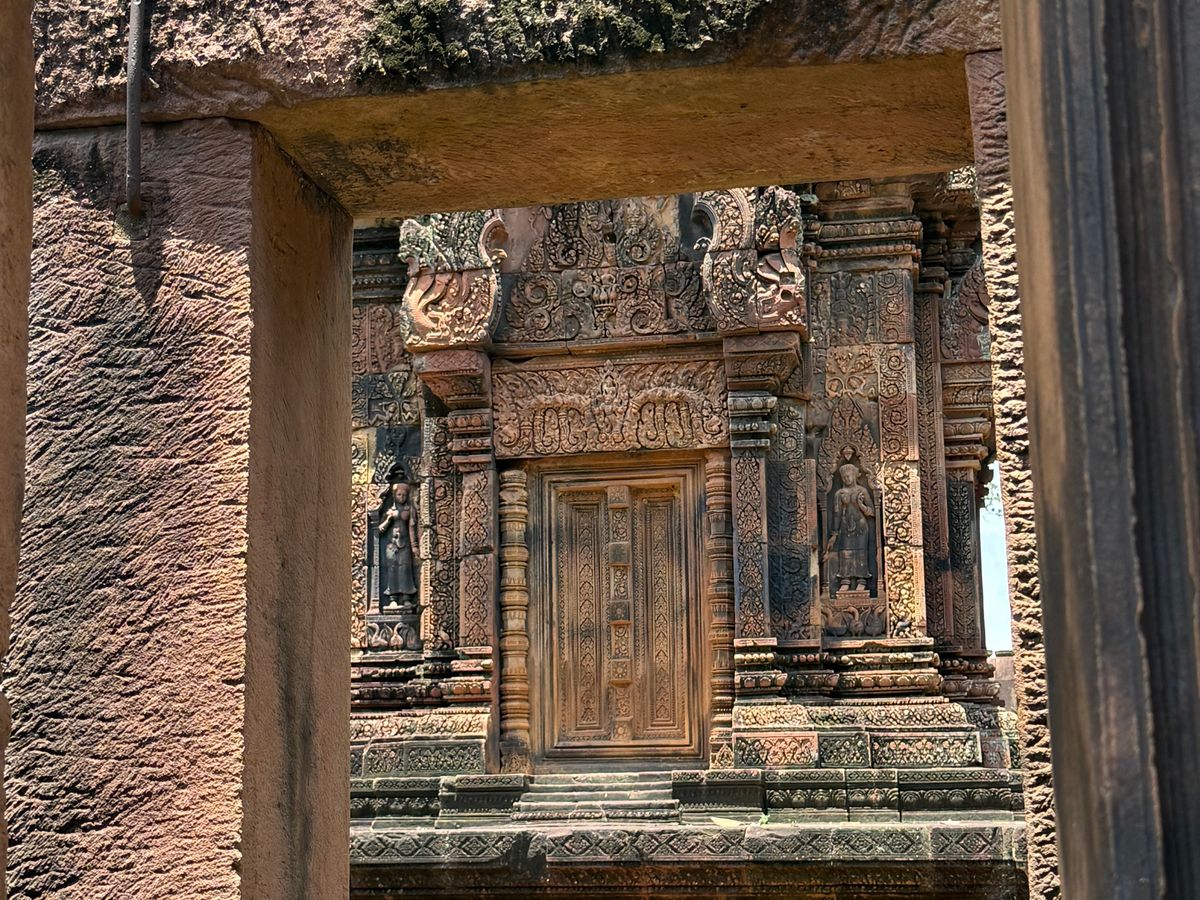 おっしゃる通り、このバンテアイスレイ寺院はこじんまりとしておりますが、彫刻はクメール美術の催行到達点に達した寺院といわれており堀の深い精緻な彫刻が見ものです。