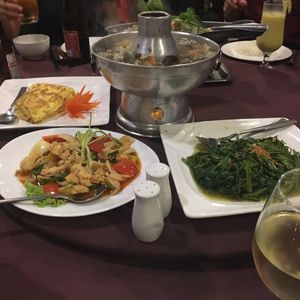 セットディナーは賑わって綺麗なレストラン、スープに空芯菜はすごーく美味しかったです。メインはちょっと物足りなく、お肉とデザートを追加しちゃいましたが、これまた美味しかったです!!いろんなお料理が頼みやすいお値段で美味しいニアリークメールさんでした。