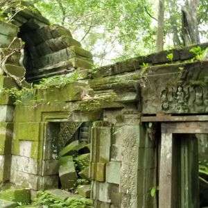 赤土と細かなレリーフが美しいバンテアイスレイ、苔むして崩壊した遺跡