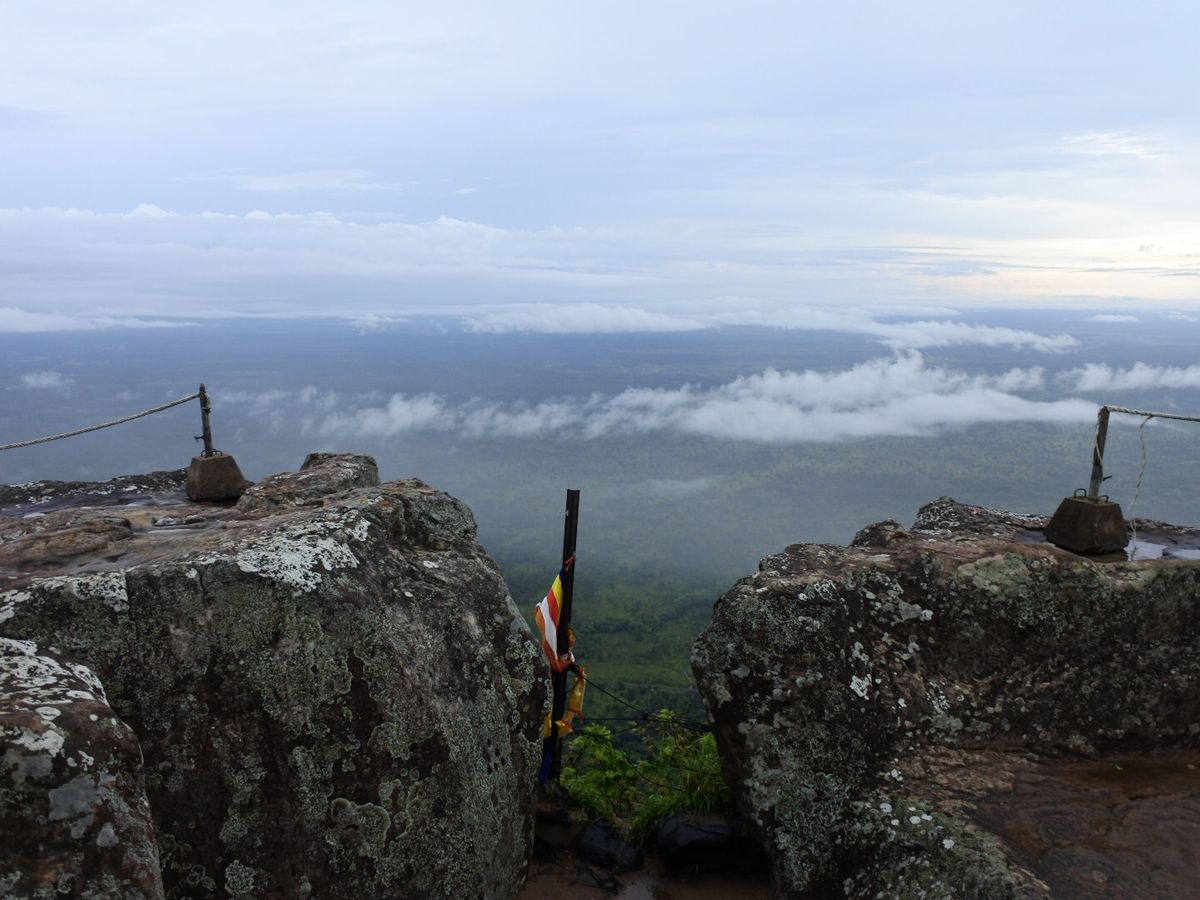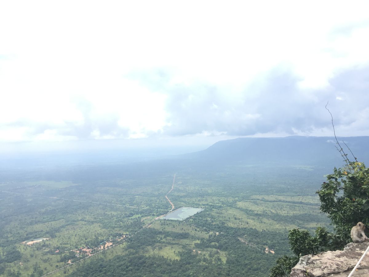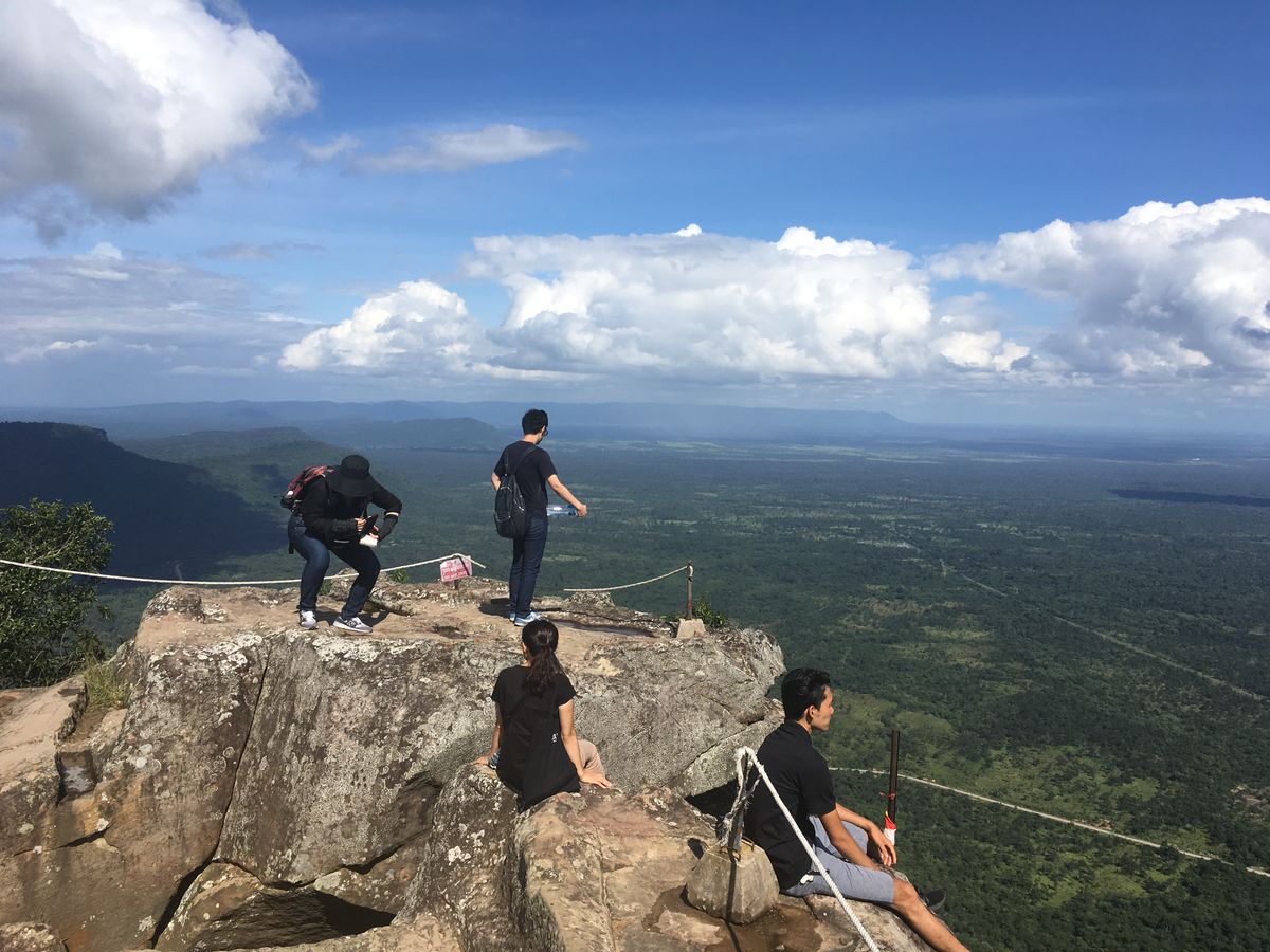1時間くらい遺跡を見ながら山を登っていくと国境です。雨季だったので天候が心配でしたが雨季の方が景色がきれいに見えるそうです。崖に腰掛けて写真を撮り良い思い出です!