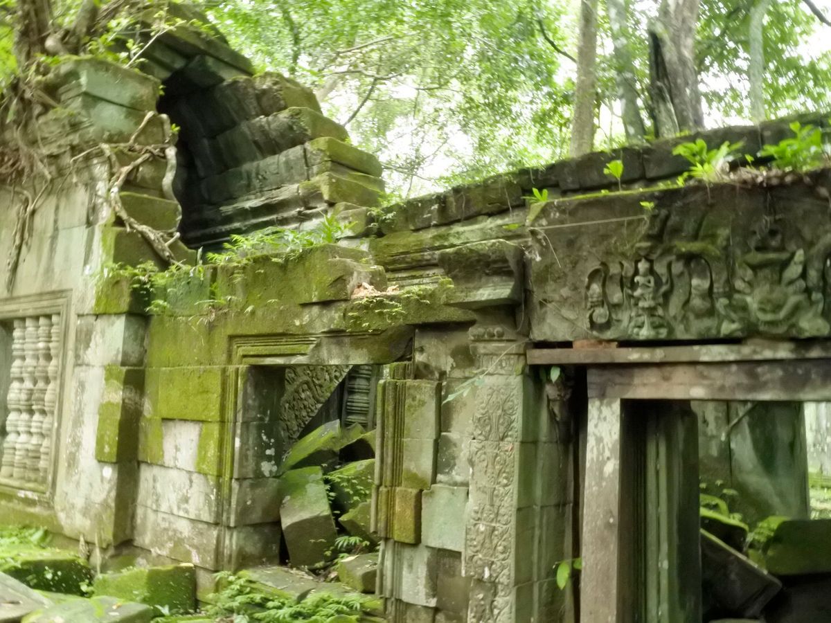 赤土と細かなレリーフが美しいバンテアイスレイ、苔むして崩壊した遺跡
