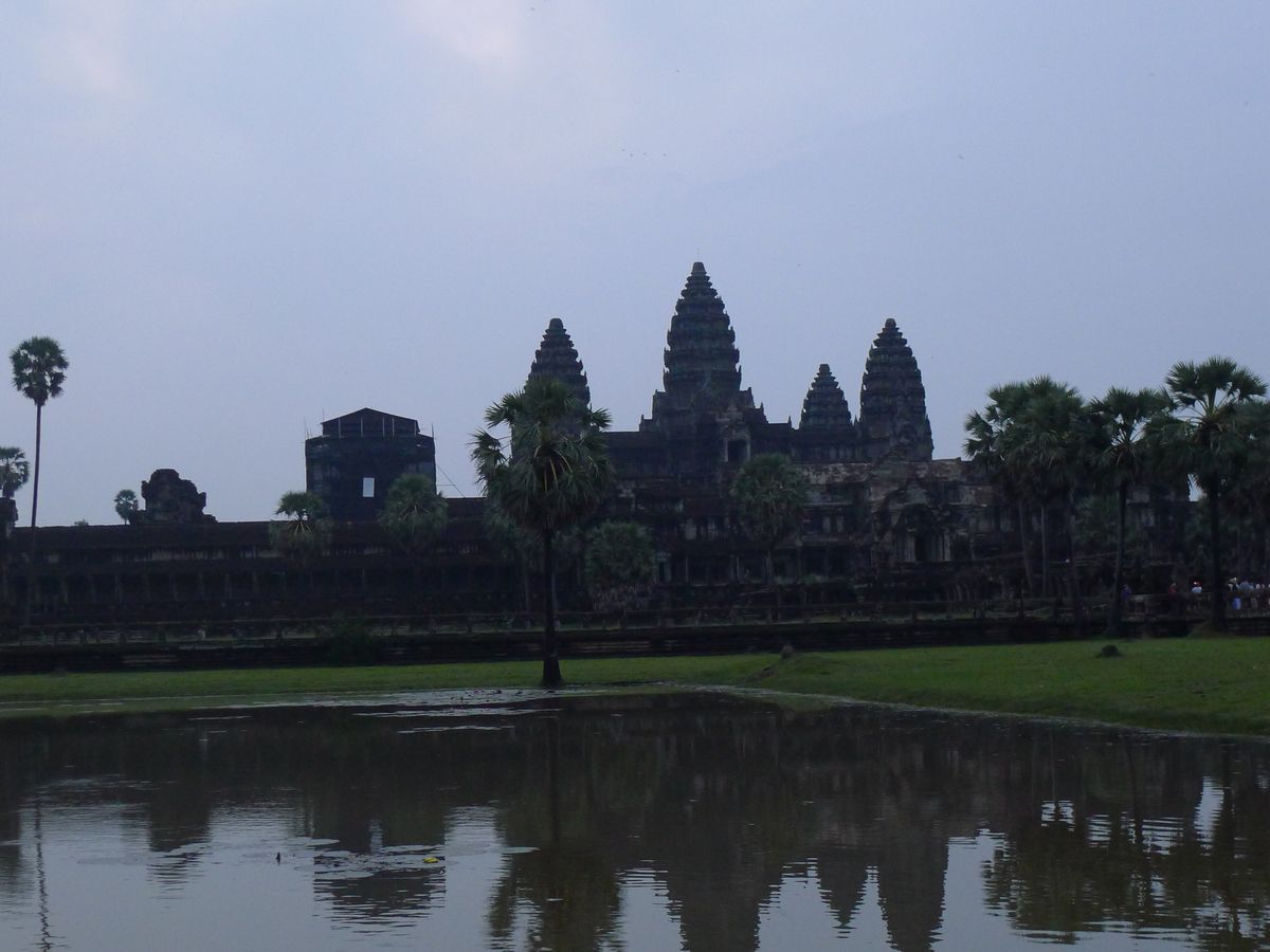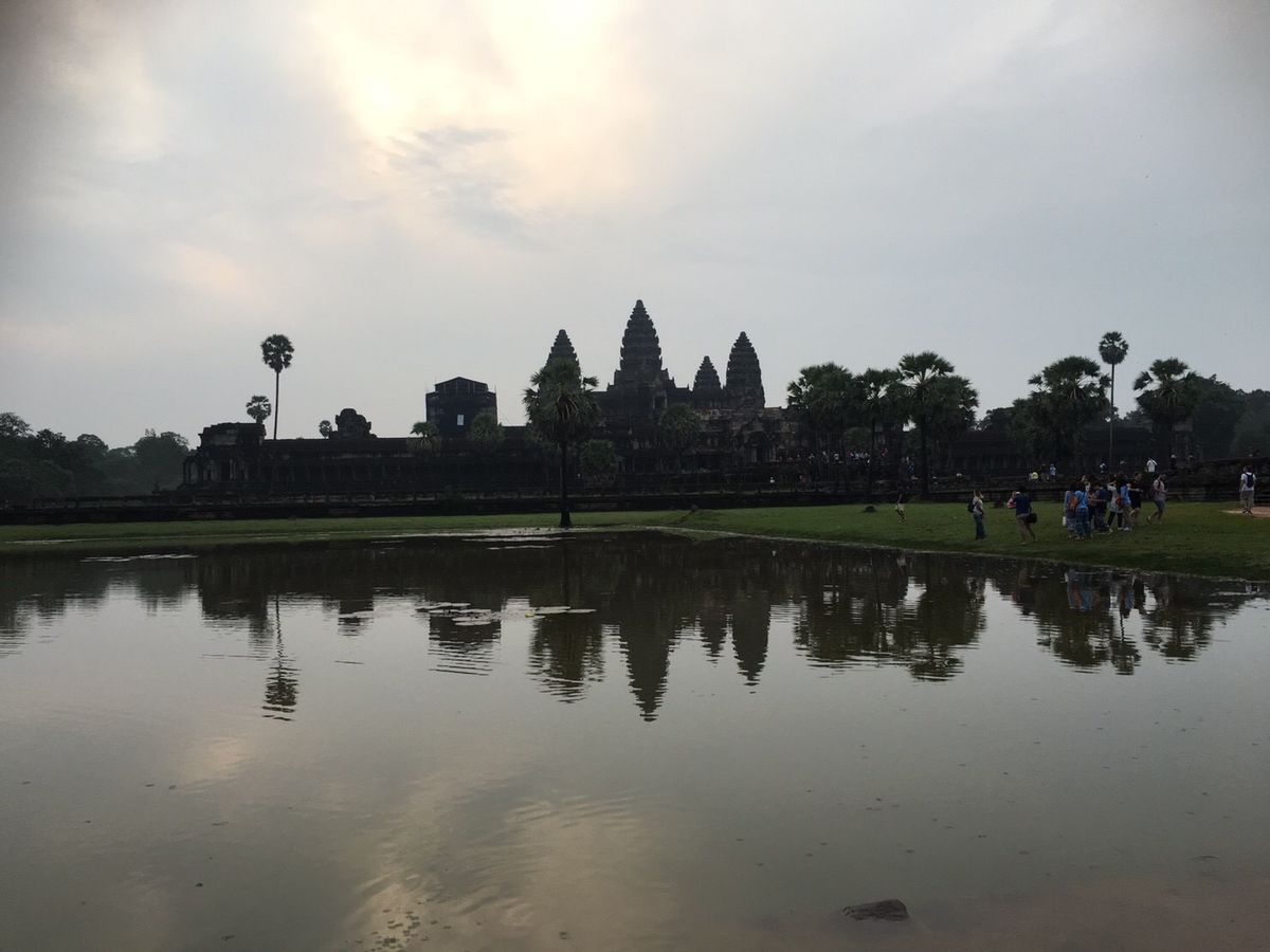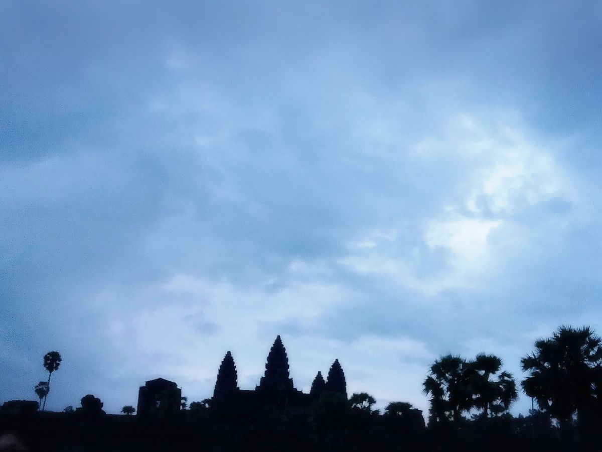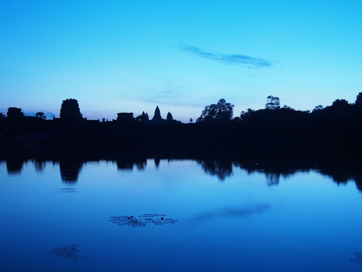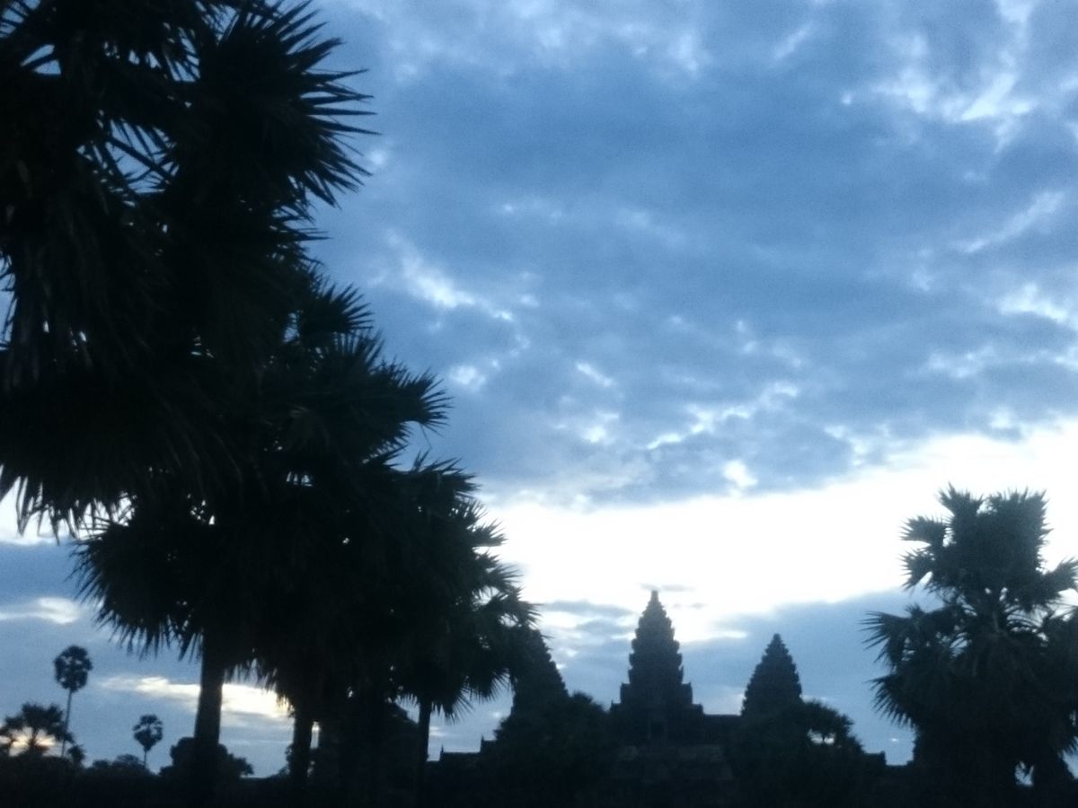 アンコールワットに入る前にチケットを購入します。日が昇る前の景色がすごくきれいでした。朝日は10月末期の時点で3つ立っている建物の右から上ってきました。朝日が昇る前の方がきれいだったかなあ。