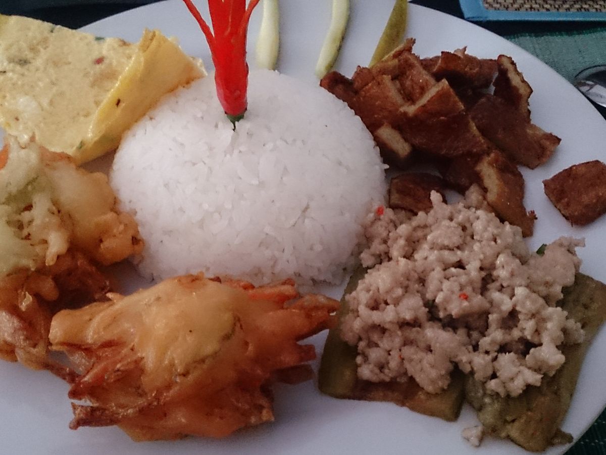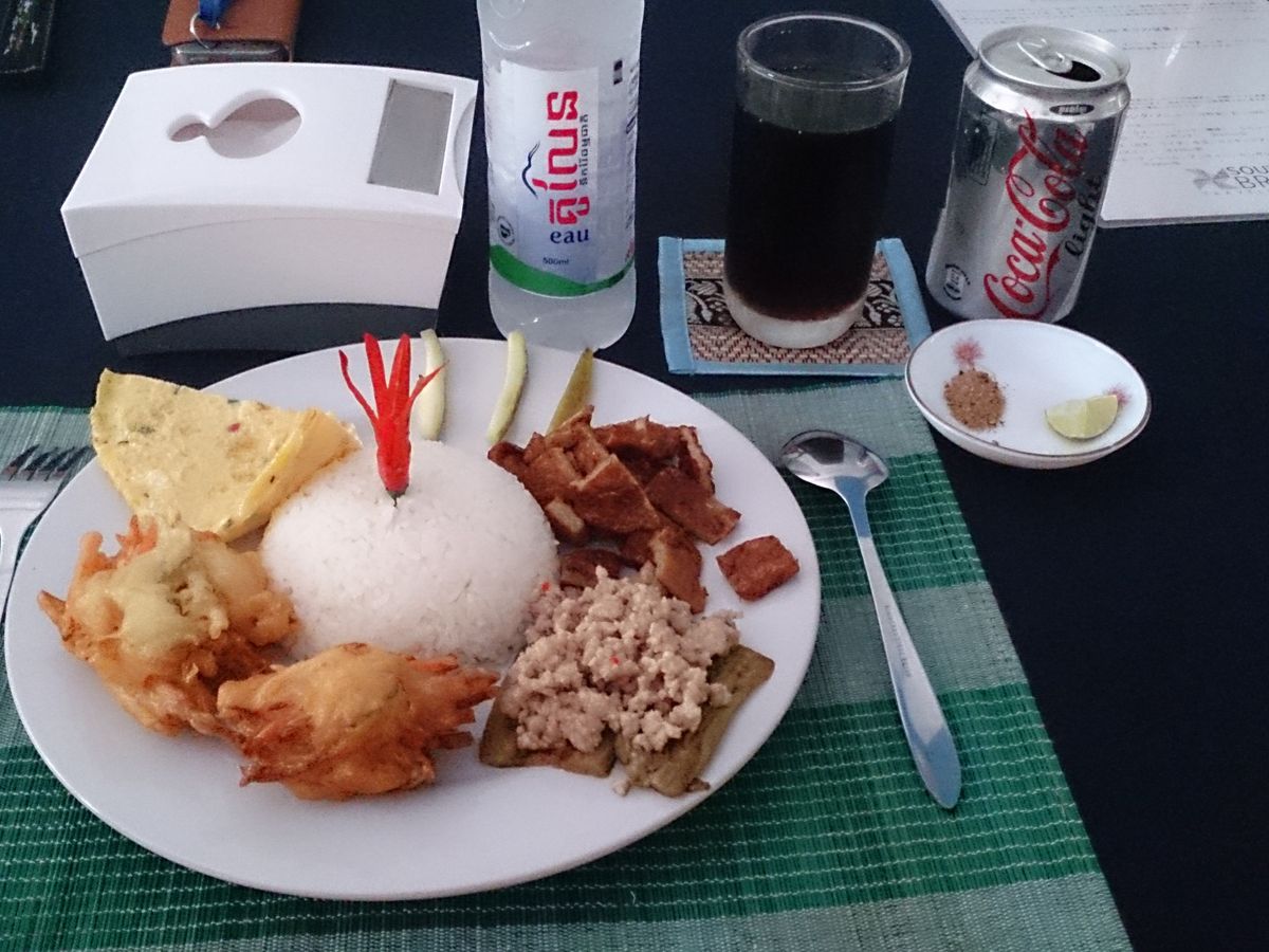 次に食事についてですが、朝はアンコールワット観光後に目の前のレストランで食事をします。ココでツアーメイトと同席して若干コミュニケーションが取れるのもいいと思います。この日は総勢6名でしたので和やかに休憩も兼ねて過ごせました(ビールで乾杯もできます)。メニューは結構たくさんあり、価格も別段高くなく、味も悪くないです。一日通しての参加は私含めて2名でしたが、その場合のアモックの昼食は男性なら若干少なく感じるかもしれません。追加で何か頼んだほうがいいかもです。午後のベンメリアは別の半日ツアーと混載なのでしょうか、午前の部が終わってから約2時間強レストランで休憩となります。私達は2人残されたので、食後は相談して近くのマッサージに行きました。