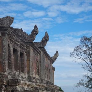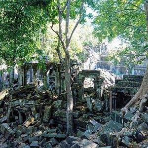 ベンメリアは、カンボジアにあるアンコール遺跡のひとつです。有名なアンコールワット遺跡の東40kmの森の中にあります。平面展開型の巨大寺院ですが、損傷が激しく、修復がほどこされないまま放置され、まだ遺跡の全貌は明らかになっていません。建物が苔むし、建造物のいたるところに植物が根を伸ばし覆っているさまから、「天空の城ラピュタ」のモデルの一つではないかとも言われています。ベンメリアとは蓮池の意味で、環濠には蓮の花が咲いています。
