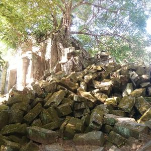 ベンメリアは、カンボジアにあるアンコール遺跡のひとつです。有名なアンコールワット遺跡の東40kmの森の中にあります。平面展開型の巨大寺院ですが、損傷が激しく、修復がほどこされないまま放置され、まだ遺跡の全貌は明らかになっていません。建物が苔むし、建造物のいたるところに植物が根を伸ばし覆っているさまから、「天空の城ラピュタ」のモデルの一つではないかとも言われています。ベンメリアとは蓮池の意味で、環濠には蓮の花が咲いています。