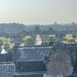 アンコールワットの高台から見下ろした壮大な景色。一直線に続く参道が、神聖な寺院へと導くかのように伸びています。緑豊かな風景と遺跡が調和し、時を超えた神秘的な雰囲気を醸し出しています。
