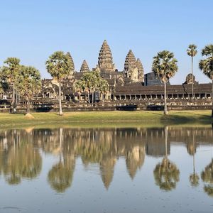 水面に映るアンコールワットの幻想的な風景。5つの塔が美しくそびえ立ち、青空とヤシの木が調和した壮観な光景が広がります。
