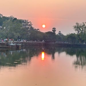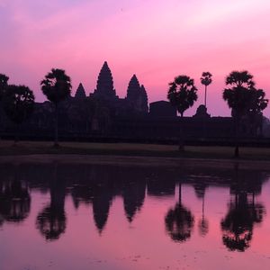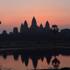 アンコールワットの朝の朝焼けと堀にうつる 時間の経過を楽しむ空間