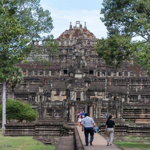 プノン・バケン寺院は、カンボジアにあるアンコール遺跡のひとつです。標高65mのプノン・バケン山の上に建つヒンドゥー教の寺院で、アンコールワット寺院の北西1,300m、アンコールトムの南400mの位置にあります。プノン・バケン山はプノン・クロム山、プノン・ボック山とともに、アンコール三聖山のひとつです。山のふもとまでシェムリアップ中心部からトゥクトゥクで10分、ふもとから寺院までが徒歩で10分ほどです。寺院の高さは約47mで、主祠堂は、アンコール遺跡のなかで最も高い位置に建っています。