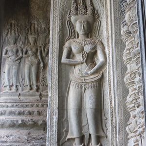 そして、アンコールワットの内部へ。基本的な回廊などの説明をしつつ、第3回楼までいく。高所恐怖症の人にはあまりにも酷な階段があり、別の観光客が相当苦労して階段を下りていた。全般的に階段はきつく幅も狭いので、足元は注意されたい。