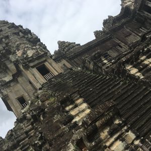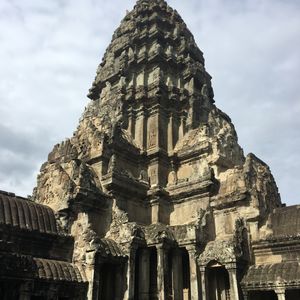 アンコールワットでの朝日のツアーに参加した後ホテルに戻り、午後から再びアンコールワットへ。ガイドさんの詳しい説明を聞きながらゆっくり回り、第三回廊も待たずに上がれました。第三回廊の階段があまりに急で、高所恐怖症の旦那さまは下で待つことに。暑さのあまり熱中症気味になり途中で休憩時間を取っていただき、ポカリを飲んでだいぶ復活。プノンバケンの入場には人数制限があるとのことで、夕日の1時間ほど前に到着して無事に入場できましたが、雲がかかりそうだったのと体調がイマイチだったこともあり、夕日を待たずに帰りました。貸切のツアーでしたので、時間が自由に使えてよかったです。